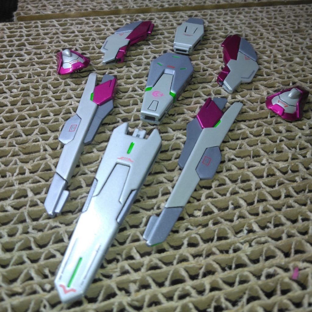 ビット完成です ヒケが凄いですね これはフラットまで削ると形状が変わるのでパテ盛るしかないんですが、一部のヒケはそういうデザインって事で納得して、平滑にするのは諦めました 近くにピンク色を配置したのでシールド状態での肩アーマービットとの親和性が高くなったかなとb まあどうしても後で無理矢理追加したので浮いて見えますがw エアリアルのシールドに近いデザインになったかなと? あと下側の左右の細長いビットは剣と合体させるやつでライフルとの合体ではバレル先端部分に来るのですが、肉抜きがあるので磁石を埋めた後に塞ぎました かなり目立つのに埋めてる人が少ないのが意外なのです ワイはこの手の肉抜きは看過できないんやが(^_^;)
