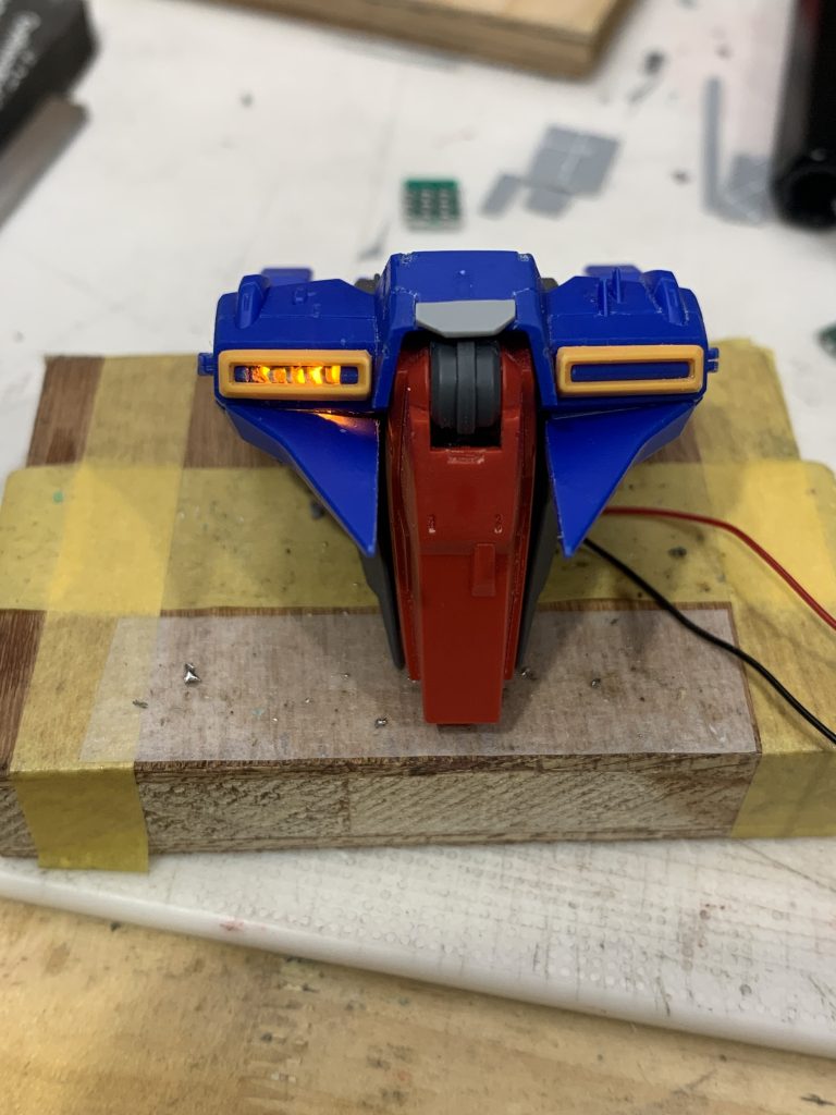 背面のバーニア類ばかり光らせているので、前面にも発光部が欲しい!