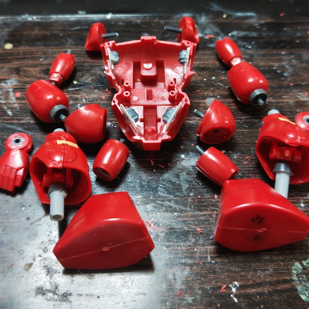 今回、各関節を接続するのに、コトブキヤのジョイントセットを多用しました。これ、素材は多分今ABSの代わりに使われているKPSってやつだと思うんですけど、軸穴が全て3㎜径なんです。それで、気が利いてるというか、当然というか、ランナーが3㎜径なので、軸として使えるんですね。