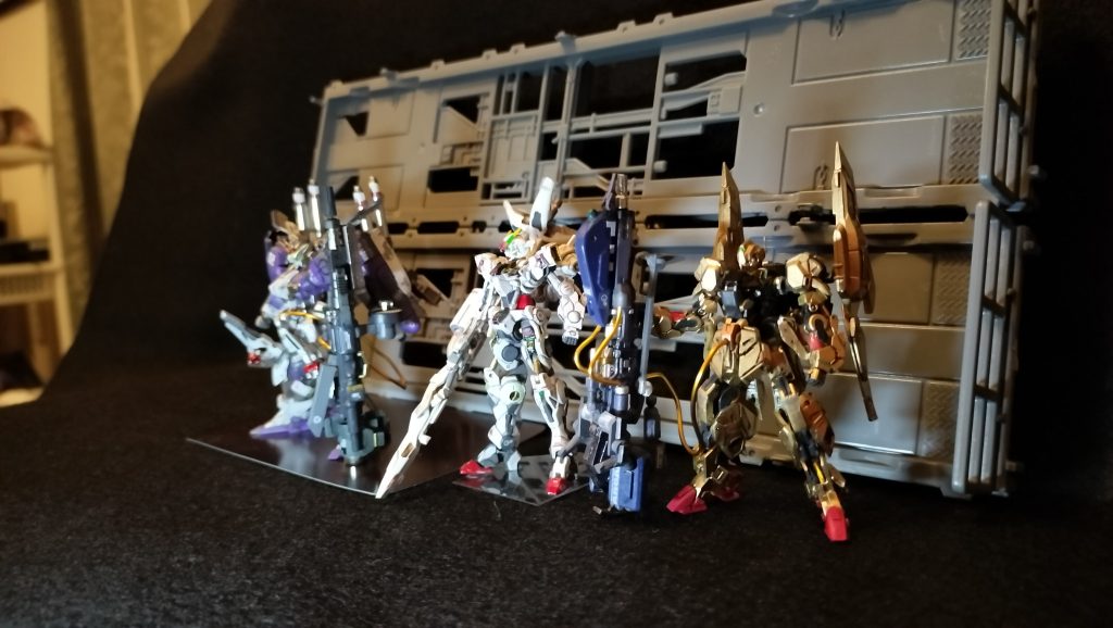 ●「ふぉー、ふぁーいぶ出撃だー」と3台並行接続すると、HG2台並べての格納庫ができあがり♡