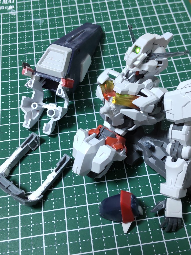 ■といいつつもキャリバーンは他のエアリアル系と違って脛下の交換がしやすいことに気づいて、30MMのエスポジットの足を装着。姿勢制御用の脚なのに逆関節風になり、単純に足も長くなったので不思議なバランスに。足先の向きは写真3枚目のが尖った雰囲気が出るけど、ガンダムの文脈的には2枚目のが親和性が高そう。なんかいっそう白系の配色のが似合いそうですがカラーリングは変えちゃいます。