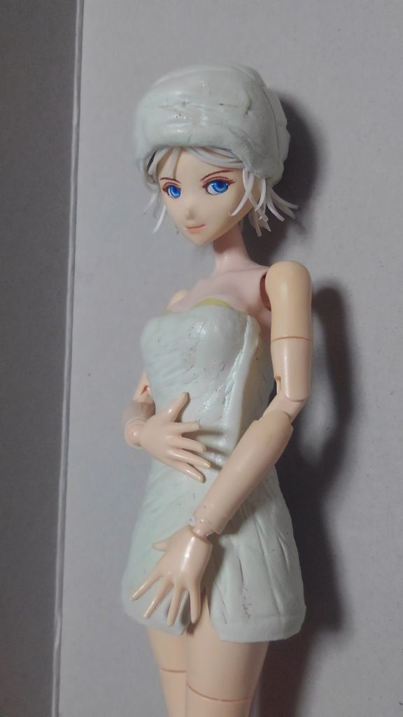 作成中の入浴セイラです。パテを盛って乾いたところです。露出的にこれはダメかもわからんね。コントでチラ出しくらいにして対応しようかなと思います。それも全身は無理かな。タオルはもっとピッチリが理想ではありますが脚が動かなくなるので、少しだけ末広がりです。