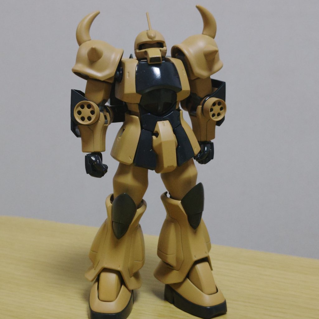駐屯地グフの基本塗装がようやく終わりました。サンドイエローは缶スプレーで、あとはグレーをちょいちょいと筆塗りするだけ、と思ったら、思いのほかグレーのパーツが多くて大変でした。
