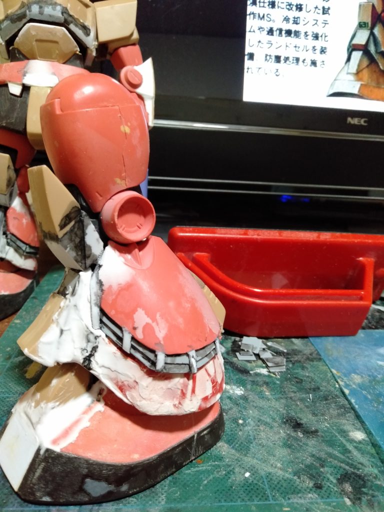 MGリックドム改造 トロピカルテストタイプ 改造状況 フレアスカートのフィンはこんな感じになりました。まだやはり微調整していますが左足だけで疲れがMAXになったので、もう就寝して朝からまた、ボチボチと作業します。初級の方でも真似できるような簡単改造なので、真似ても良いですよ(笑)