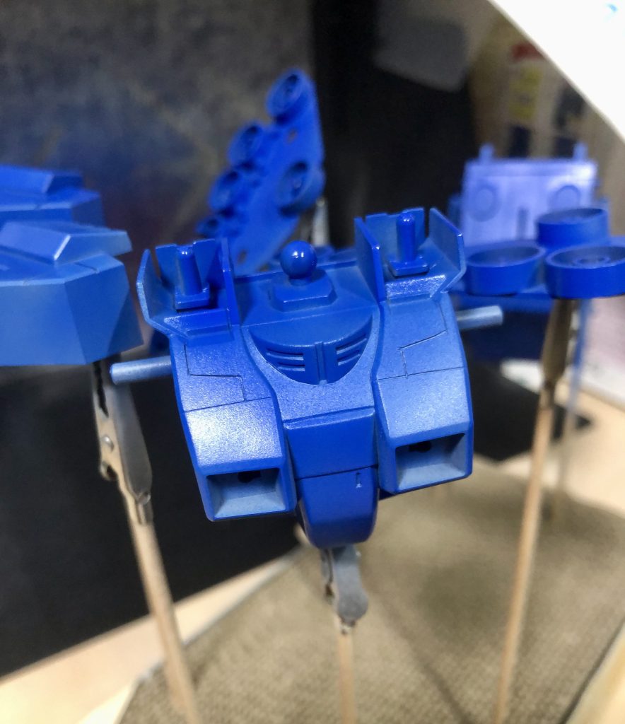 まず胸部とタンクの青をクレオスのコバルトブルー90%とホワイト10%で調色。牛乳みたいな濃度を目指したらほぼ1:1くらいの希釈で塗装。