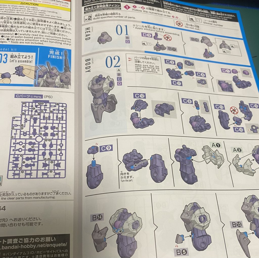 ハインドリーシュトルム 足元以外は意外と好きなデザインの機体。今回はどんな風に進めているかも解説しときます。箱を開けたら説明書を軽くみてパーツとシールの確認。クリアパーツとシールを別の袋にまとめておく。その後説明書をみて、単純に組み合わせるパーツをランナー上で組み合わせて、カラーごとのサーフェイサーをかけます。