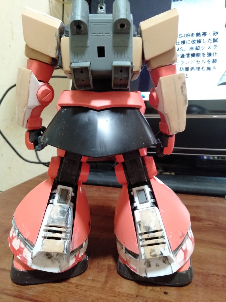 MGリックドム改造トロピカルテストタイプ進行状況です、両肩の位置を変更しました、いかり肩になってドムらしくなったかな?それと肩の内部にプラバンにてMGドムの様なスリットを付け、脚部の後ろスカート上部に悩んでいたラジエターを付けました。コレは妄想で「プロトタイプドム時は熱帯、砂漠で使用することまでは前提して無かったので、ホバーの放熱の処理に防塵を兼ねて後部に付けた」という感じです。まぁ「”トロピカルテストタイプ”という事で砂漠での実地をした時に現場で付けた」と、俺個人的には当初はフィン型のスリットを付けて下の内部が見えた時の対処としてましたが、このままの方が面白いかなって(笑)ランドセルも仮付けしてバランス的にパイプの処理を変えるだけでいいかなと。やっと50❔70%くらいできてきたかと想いますが、また悪い癖が出てやり直しをするのではないかと・・・俺自身が怖いですwww
