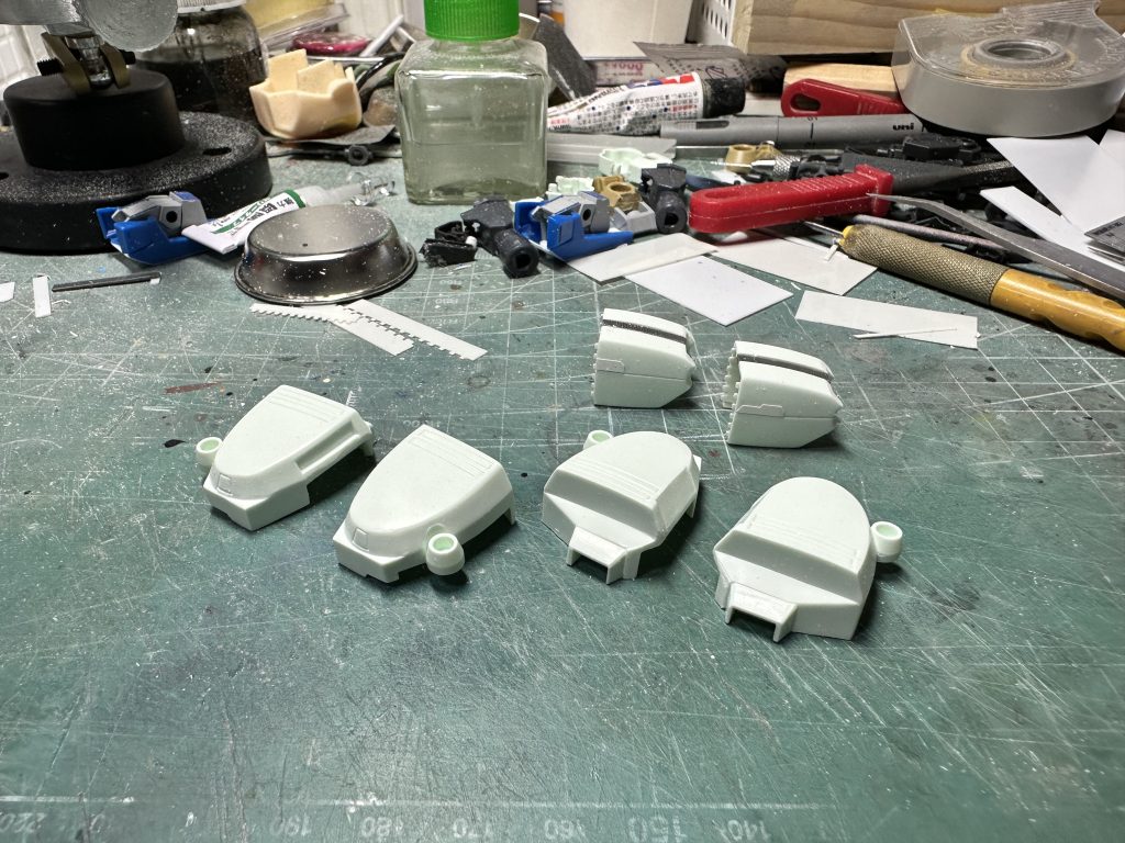1枚目画像の奥にあるのはふともも部分の外装ですが、裏側の1面は切り飛ばして3面のみにして、中央で割って幅増ししてあります。