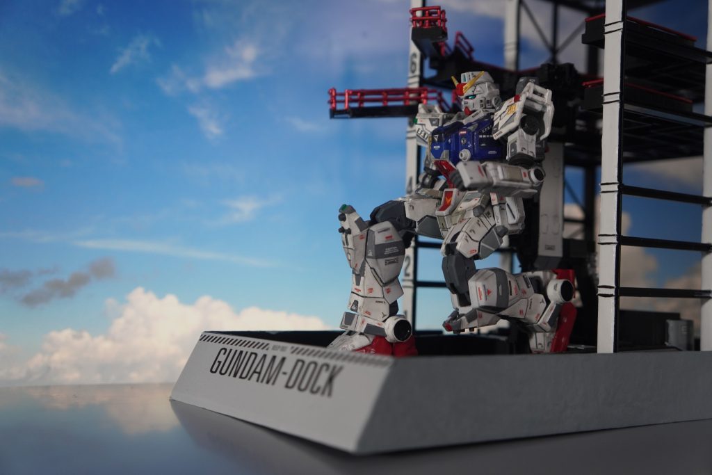台座前面の文字(GUNDAM-DOCK)以外のシールは使わず、1,2列目の柱を白色に。(3列目は塗るのが難しいので断念)