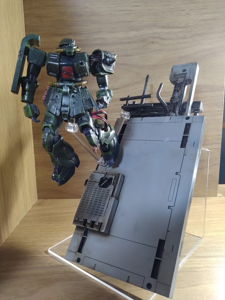 スタンドもクリアーの市販品を使用するのではなく丈夫な真鍮線でザクを支えた方が良いと思います。