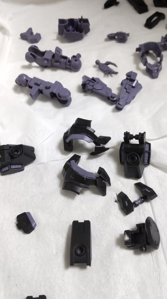 マスキング下手すぎてハミでまくり。延々出てくるポツポツ穴を消すために瞬着で埋めてヤスりがけ。胸周りの形状と配色で難航してます。紫系の色はなんとか入れたかったので、陽咲さんのキャリバーンを参考にHJVパープルグレーをフレームと差し色に使いました。紫系って特に暗い色の種類が少なくてなかなか合う色を探しづらいですね。差し色入れる前に一回ちょっと組んだ写真見ると、胸回り真っ黒なのもこれはこれで胸がワンパーツで肥大化してる感じが出て良いかもしれません。