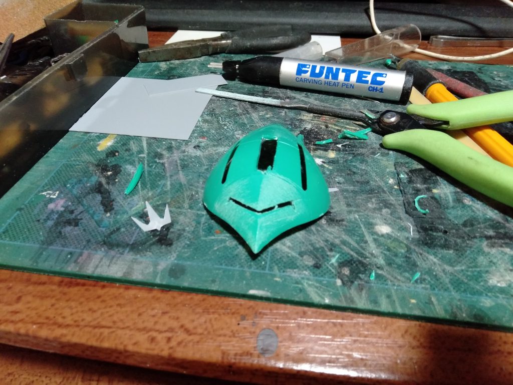とりあえず方向性が決まったので、小改造開始(笑)どうしても完成時にSD感が拭えない”エルメス”なので手元の”MIAエルメス”を参考に、そして設定画と見合わせて外側から中心にいくと中央で少し鋭角になるのが正解と気が付き、そこを中心に改造する事に。まずはヒートペンでコクピットの開口し真ん中もくり抜きました、そこに5mmの三角プラ棒をライターで気持ち曲げて接着。まぁまだまだ在庫があるので(また軽く発掘したら・・・4個出た(笑))未改造と比べてSSPで盛り付ける高さに間違いないかを確認する。まぁ最後尾手前は平面にしますけど、後外枠の曲がりの一部がなだらかなので変更する予定です。(*´Д`)疲れたしソロソロ・・・(つ∀-)オヤスミー