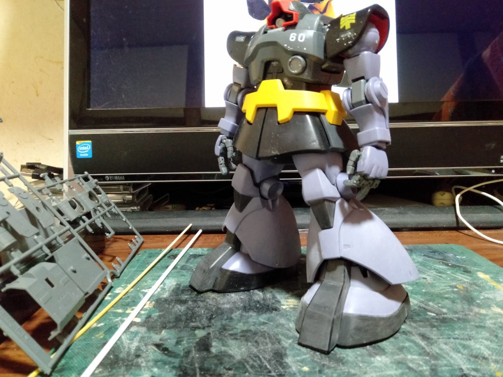 MGドムミキシング改造、熱帯戦用ドム量産型 サンダーキャットこと、ロイ・グリンウッド少佐専用機の改造を始めました。このベースはメルカリで入手した中で断トツの出来損ないでした、両太腿を逆に取り付けて、膝関節の内部の付け根を両方破損して接着してるは、全てのパーツは所謂二度切り状態で素人が模型雑誌で推奨してるのをちゃんと製作する人向けと理解していないまま組み立て、多分30代(パチ組でSD位しかしてない)おっさんが自信満々で出品してました。しかも小学生でも説明書をちゃんと見て組み立てても、甲は成りませんし多分仕事も理解しないでいい加減な感じでしてるんでしょうね?(笑) 愚痴はさておき、仕方が無いので関節の折れた個所は、ピンバイス等で開口し中へ3mmのプラ棒を差し込んで再補強して無いしました。やはり知人の云った「そんなKITを買うより自分で一から組み立てた方が楽だろ?」とい言葉が頭の中で渦巻いてましたよ?ホント大変これは。疲れたので一休みwww
