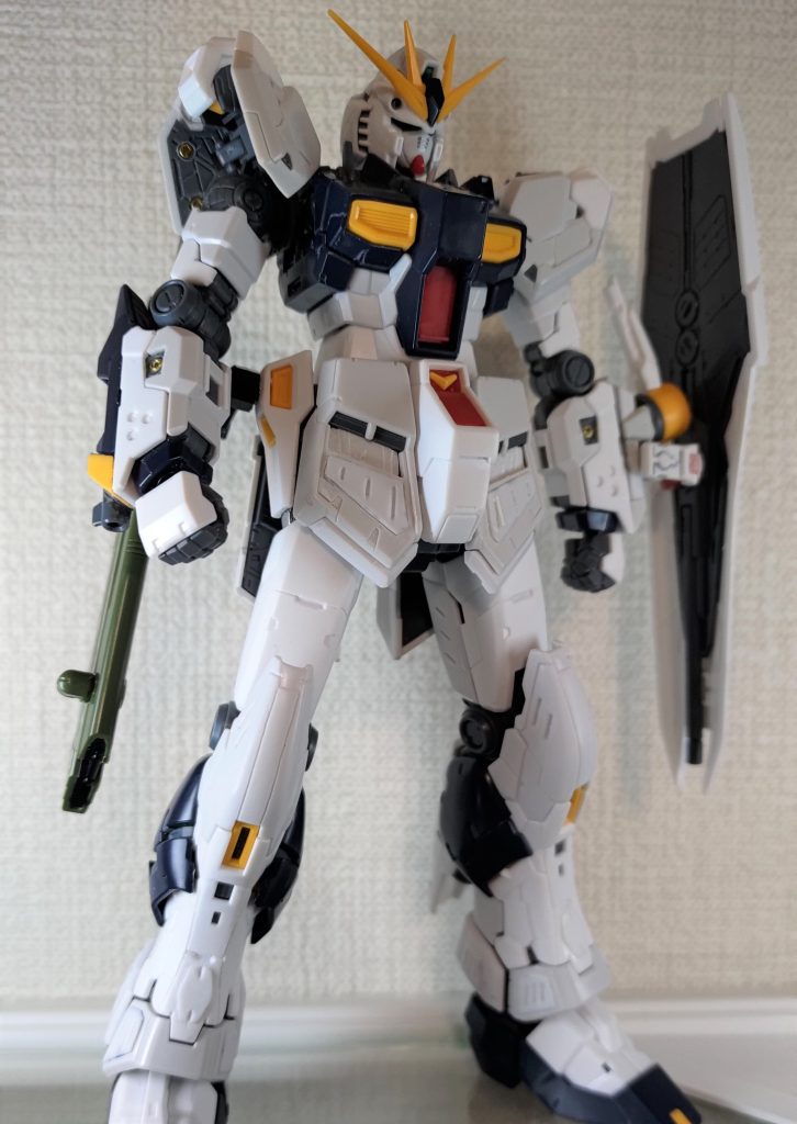 メイン写真:目尻の上、ひさしの部分をちょっと剃りこみました。心なしかキリっとした目付きになったと思います。左手の盾は従来通りに肘の外側へ構えられるほか、ジョイントを前方へ伸ばせば前腕部の横に付けることも可能です。右腰にさげているのはデスティニーの長射程ビーム砲・・・当初の計画ではこれをバックパックの右に装備して、左右の重量バランスがFファンネルで偏るのを緩和しようとしてたんです。結局ダブルFファンネルになったので不要となりましたが、「絶対持たせる!これはもうνの武器なんだ!」と意地になってしまい、右腰にジョイントを設けました。位置が下がったおかげで、意外と背中にファンネル乗せても喧嘩せずに動くんですよ