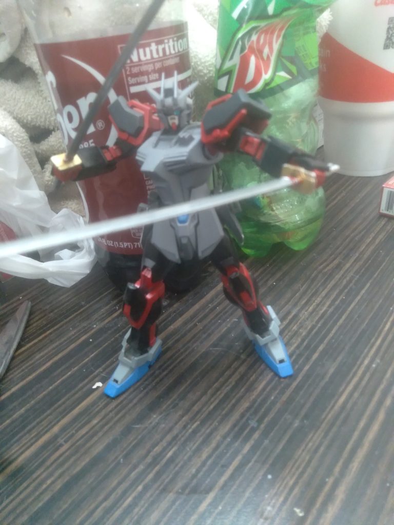 I forgot I started this project. I had an idea of making a red frame Strike custom. The torso has some work done to it. Mainly plastic plate. I also added chest vents and a sensor. The swords are from the sengoku astray. I glued some of the #11 poly caps on the side skirts. They work perfectly to hold the swords. I’m not quite finished painting it, lol. A few minutes ago, I took a spare core splendor from the hgce Impulse and drilled a hole so the aile striker pack can be delivered during battle. I have to figure out a way to mount the shield and rifle somehow.
