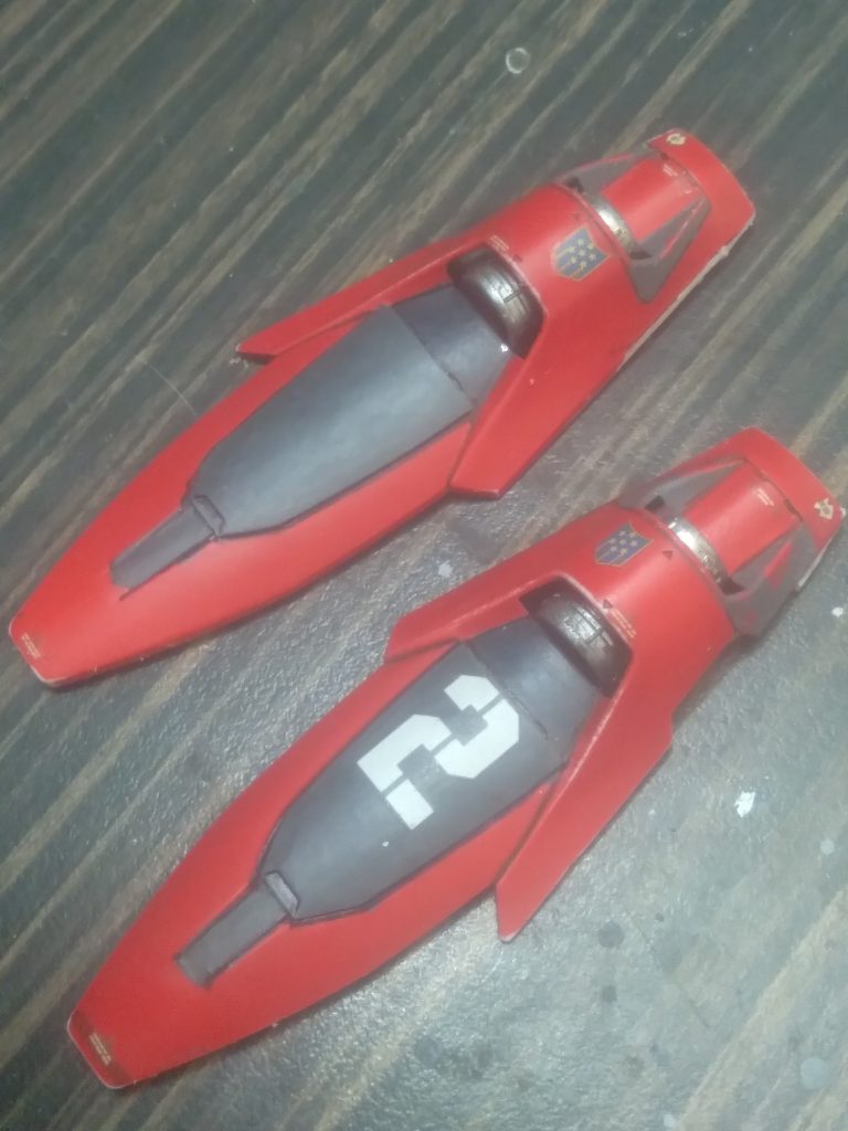 Using the rear booster parts from the hguc gp03 Stamen as the base. I cut off the connection parts and trimmed the plastic. I then glued on some plastic plate and drilled 2 holes. I plan on using them as side skirts for a build.
