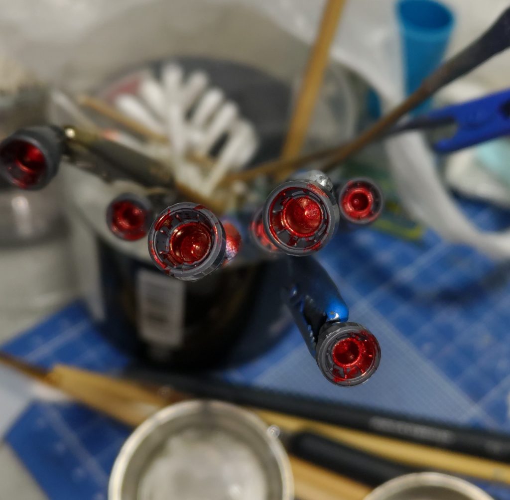 日曜も親戚の手伝いで進まず、なんかして寝ようと少し進めました😀ってバーニア切り取ってロイヤルメタレッドを奥まったところに塗っただけですが😅