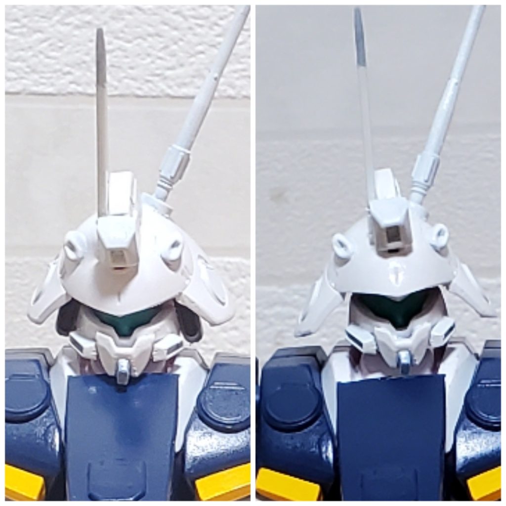 2枚目、頭部のヘルメットに対して、バイザーパーツを前面に押し出しました。また、側面にデティールアップパーツを取り付け中身のスッカスカ感(語彙力w)を消してます。