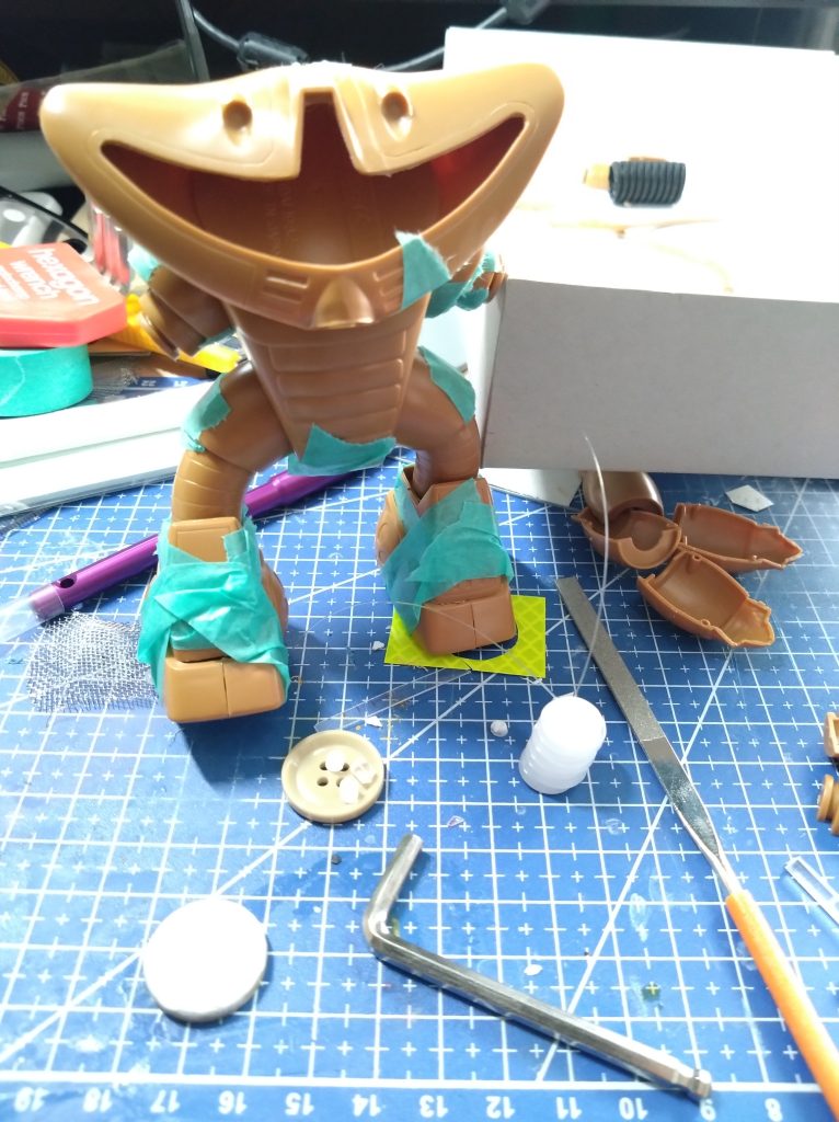 難しいので切り取りしたモノアイの足りない部分にパテ盛りしてスジボリ。コレはまぁまぁ。😄