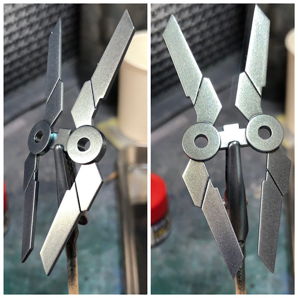さらにその上から同シリーズカラーのトルマリングリーンをフワッと吹きつけ角度によって薄ら緑色に見える様仕上げることで、逆シャアでのサイコフレーム部材が発光するイメージを表現しようと思いました