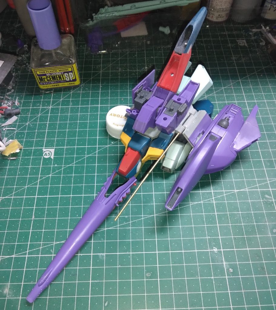 リガズィカスタム進捗状況 襟部分の穴を埋める板をプラ板で組みました 背中の板にヒンジを取り付けBWSとの接続準備完了 いよいよBWSに取りかかりました 予定してる追加ギミックの一部でもある渾身のテールスタビライザーの曲線に納得しつつ・・ 写真1枚目と2枚目の比較ですが、スペースファイター形態の時にバックパックを正位置にするか後方に下げるか悩み中 当然のように後ろに下げるつもりで制作プランを考えてましたが 個人的には正位置の方が良さそうに見えます 正位置の方が機首~コックピットブロック ~バックパック~スタビライザーのラインが綺麗に出る気がする てかこれ、なんか見たことある型だと思ったら・・せや!マゼラトップみたいでカッコよくない?皆さんの意見求む( ´∀`) 3枚目:肩が大きすぎて絶対収まらないのです 肩で一際飛び出してるスラスターを畳めるように加工しようかと思うけど、厚みがどうにもならないね(=_=;) するとどうだ?腕の位置が内側に寄らないので、腰のブロックパーツを内側に縮めなくて良いのである むしろ逆に腰ブロックを外側に広げ腕を包み込むまで考えたが・・・もう腰のブロックは固定で良いわw なお、前回紹介したコックピットブロック 裏側に飛び出てる黒いピンがパイロットシート💺の回転レバーですね 下に下げるとスペースファイター形態でのシート位置になりまし