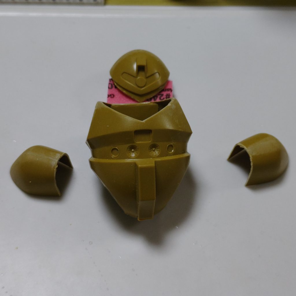 (写真1枚目)キットのフォルムは活かすつもりだったんですが、ポーズをつけるために頭と肩アーマーを切り離しました。これで顎を引いて、肩アーマーを前後に振ることができます。