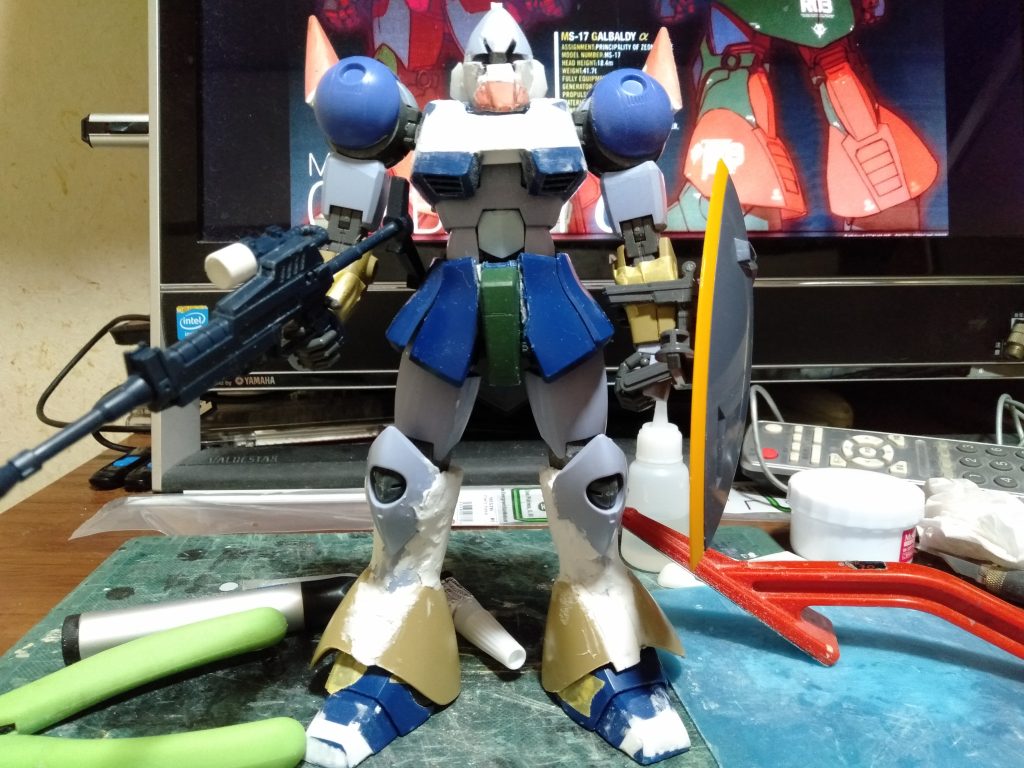 MGギャン改造 ガルバルディα製作進行状況、両肩の突起はMGゲルググVer1・0より流用した部分の基部をSSPパテにて整形。両脚も形が違うので不要な部分は切除、のちにマスキングテープにて養生した内部フレームを差し込んでから、切除した個所をSSPパテで整形し、気が付けばこのままでは脚部スカート内部に3連バーニアを仕込めないので現在試案中(笑)ビームライフルは調べてみると、ガルバルディβの基礎になったような記述を視付けたのでそれに習い、ゲルググ配備の物との中間にと妄想してこうなりました。胸部はやはり形が非なるので、両ダクトから上約5mmを切断し、両脇の基部は水平にするので切り込みを付けて平面に整形。胸部開口部は斜めになる箇所にSSPパテで整形、コクピット搭乗口の上部にあるダクトを設置したいので、L型プラ棒とSSPパテにて整形しました。あとは腰部の後部スカート上部に旧1/100ゲルググのスカート部のダクトを使用して、取り付けましたコレはサイズ的に好かったので。とりあえず本日の作業はココまでですね?疲れたしwww ほなな!