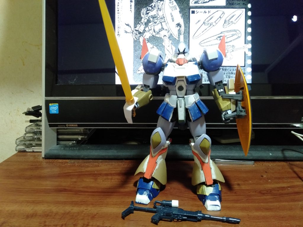 MGギャン改造 ガルバルディα改造進行状況、一応一通りの改造個所は終わり、ココからは塗装に移行する為の細部の手直しを行う予定です。60%位でしょうか今のトコロ、俺自身としては満足ですね。 今回の製作ですがバックパックはMGギャンのをベースに約1・2cmを延長大河原邦男の設定画でもそのような描写があるので、エバーグリーンの中空パイプ11・1を使用して延長部に取り付けた後にサイズが足らないので周囲に同じ商品で中空パイプを半分にしたのを張り付けて、SSPパテで整形し、あとはジャンクパーツにてでっち上げました(笑)後ろにPC画面の資料の画像が多分、誰かしらのイラストでガルバルディαのビームサーベルと思わしきモノなので、これを参考に製作したのが握らせてるビームサーベルです。プラバンとギャン用のサーベルを使い製作しました。 さて今日は満足して就寝できそうです。先日やっとケンプファーの黒いのを注文出来たし、ホントε-(´∀`*)ホッとしましたよほな寝ますわ、またなぁ~(@^^)/~~~