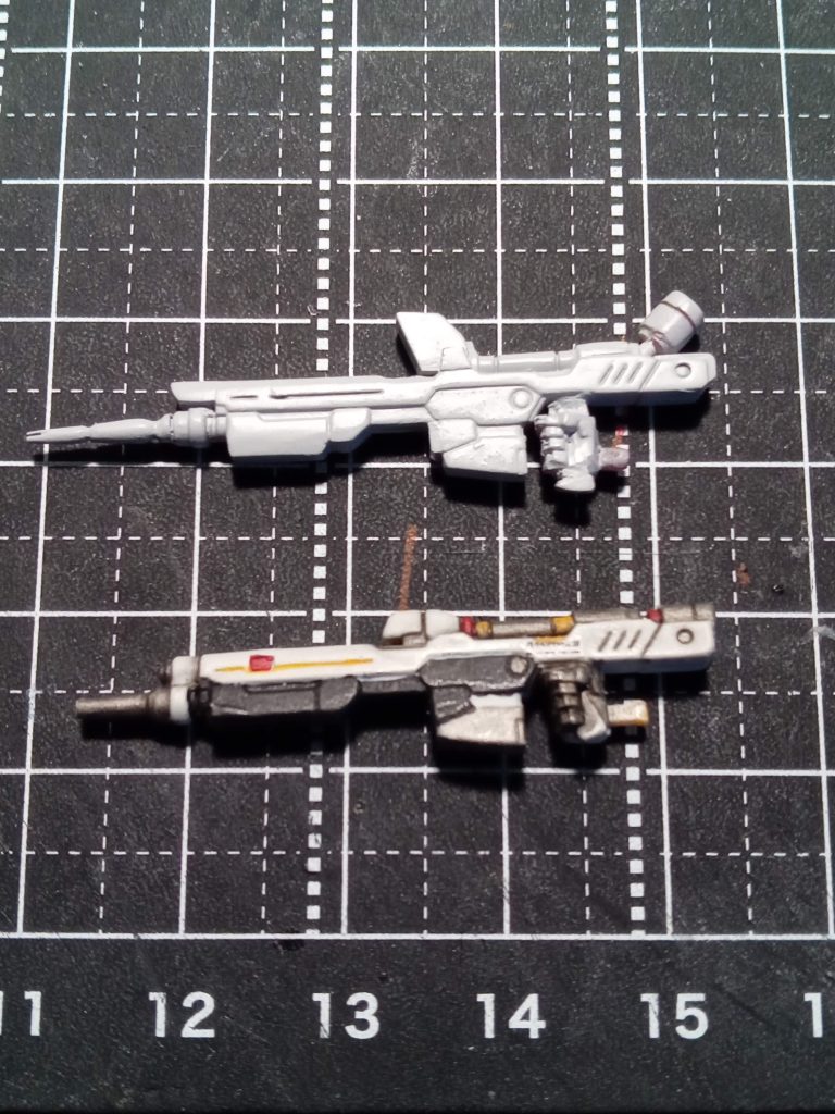 ライフルは、ガレキのライフルのデザインが好きなので(RGのものもガレキによせてるのかな)似せる。銃身の先は伸ばしランナーでロクロを回す感じで(ピンセットでつまんだ状態でヤスリをあて手を動かす戦法w)削りだし形をつくりました。意外とうまくできたかな。後ろのタンクみたいなものは分離して、前回のハイニューの改修で塗装はがしでドロドロに溶けたやつの遺品からも切り離し、2つ合わせて円柱にしランナーを刺して完成。その他のディテールはプラ板で。