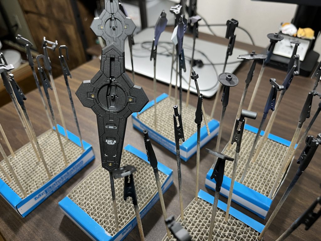とはいえ、武器の一部、フレーム色に塗りたい部分を塗装・デカール・トップコートまで終わりました。運よく手に入ったベギルペンデ2体目から盾を拝借。どうにか2枚持ちにできるよう考案中です笑