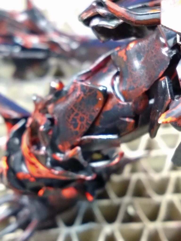 今日の休みを利用してバスターガンダムやってまして、オリジナル武装を追加って思ってましたが何となく出来てますがアリなのか?迷いまして思うように進みません。なので以前から気になってたイフリートの塗装してみました。というのも皮膚の表面の黒い部分の合間から赤い細かな模様が本来あり、どうすれば?って製作時は思い浮かばなかったのですがその後!クラック塗装ってのを利用すればひび割れた皮膚の中に赤が見えて良くなるのではと思ってクラック塗装調べてやってみました。メイン写真が1番分かり易いです。他には全体にやりましたが効果が出ませんでした。練習が必要です。方法は水性塗料の赤を(希釈しすぎたのかも)全体に適当に塗り放置。半日くらい乾燥してから筆塗りでアクリジョンの黒を塗りました。もっと全体的に出て欲しかったのですがイマイチでした。またやってみようと思います。