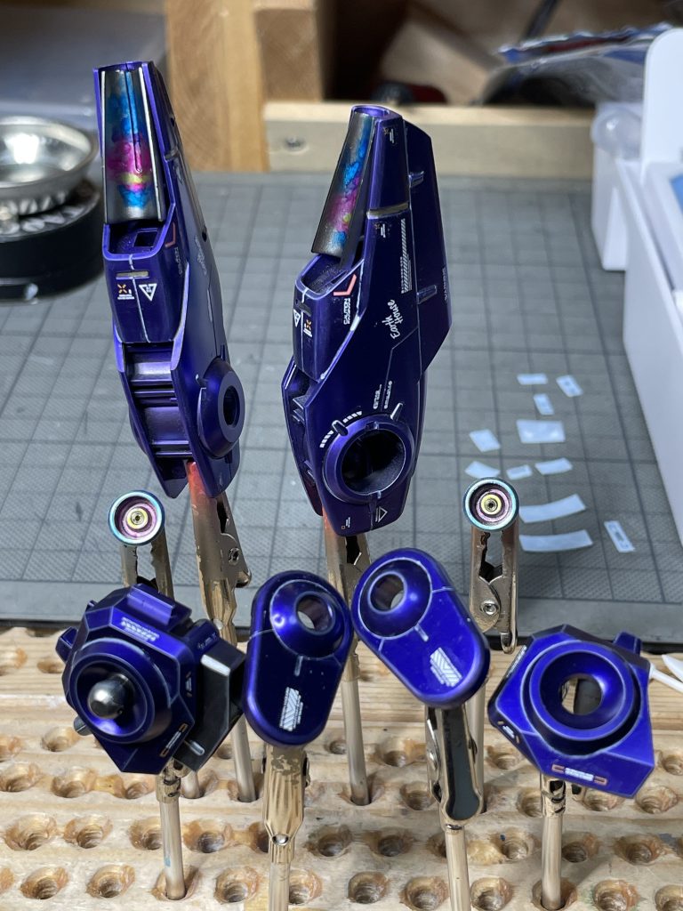 なんとかデカール貼り終えました。取説に位置指定とかないので、色々な作例見ながら、好みの配置をいいとこ取りで、迷走したのと、密度高めで配置したので7日間消費。写真はフライトユニットですが、スラスターの炎焼け、大袈裟にやってみました。😄ノズルの向きからありえない感じですが、良しとして次のクリアコートに行きます。