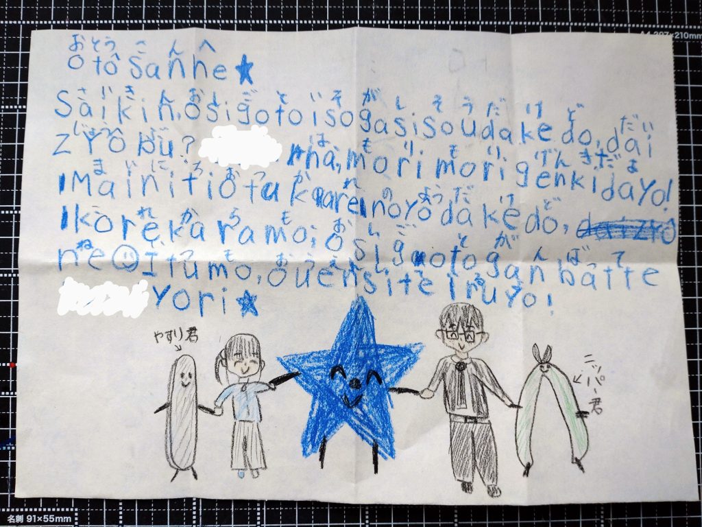 そんな時に長女から励ましの手紙が、机の上に乗っていました。最近習ったローマ字で書いてて、読みづらかったのですが…「お父さんへ 最近お仕事忙しそうだけど大丈夫?○○はモリモリ元気だよ!毎日お疲れの様だけど、お仕事頑張ってね。いつも応援しているよ。○○より」ビール飲みながら夜中に読んで、号泣でした。(歳のせいだな…)でも、この下のは、オリジナルキャラ?うちの子、大丈夫でしょうか?