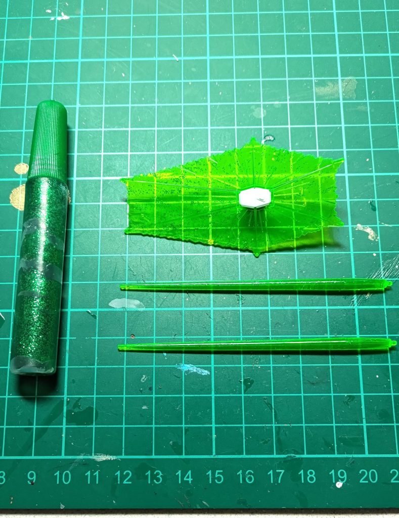 メイン写真:100均のラメ糊で、ビームエフェクトを飾ってみました。シールド裏面にラメ糊を塗った後、ビームの指向性を意識して爪楊枝でシールド中心から外枠へ向けて放射状になぞってます。糊が乾燥してからラメの保護を兼ねてタミヤアクリルのクリヤーを表裏に塗りました。サーベルも同様に。