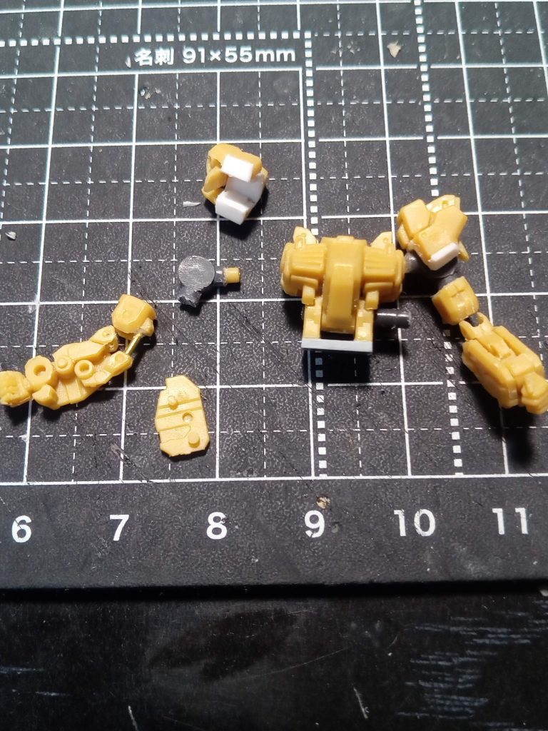 今回の関節は、クランクのようなシリンダーかましてのデザインなのでTジョインを移植は、全然違うデザインになってしまう。といいことで、ぎりぎりデザインを残しつつ、可動域を確保できるようにしてみました。2枚目の写真のようにパーツを切り離し、シリンダーのとこを真鍮パイプに置き換え、強度を確保(この部分で肘と腕を維持してる箇所)内側のクランクの上のパーツを取り除き、曲げた時にうまく奥に入り込むようにしました。