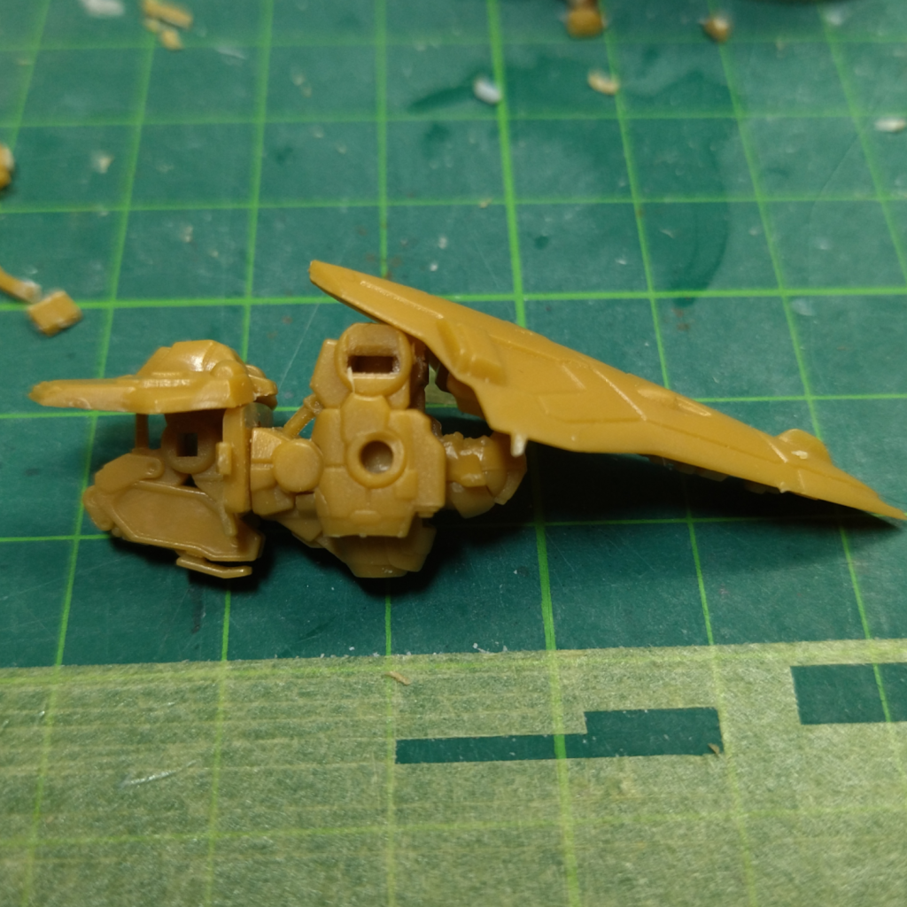 作り方③ シールドの裏パーツをカット。接続穴に瞬着パテ(3枚目赤)1mmプラ棒に硬化促進剤塗って(3枚目水色) 刺してしばらく待って硬化したらプラ棒を長めに残して切る。 頭は反対向けて接続。バックパックに1mm穴開ける(2枚目) シールドのプラ棒を少しずつ短くして、バックパックの穴に接続、位置決めを試して完了(1枚目) ※バックパックの穴の角度をシールドのプラ棒の角度に合わせて開けるのがコツです😁