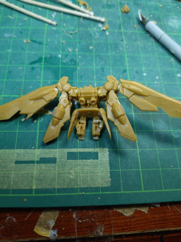 作り方⑥ ウィングの基部をぶった切ります(3枚目赤) バックパックの穴にパテを詰めて固め、1mm穴開け(2枚目青)ウィング基部に1mmプラ棒立てる(2枚目赤) ウィング2枚が平面になるように取り付け、腰アーマーは説明書どおり(3枚目) ※私はウィングを広げてみました😁