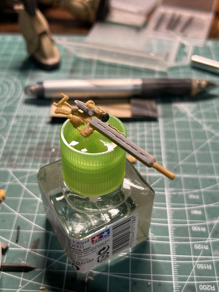 スナイパーライフルは破損防止のために元々のザクマシンガンのバックストック?がそのままです、切り飛ばした方が見た目は近くなるんだけど、そうなると貧弱だからたぶん折れるんだよなぁ😇
