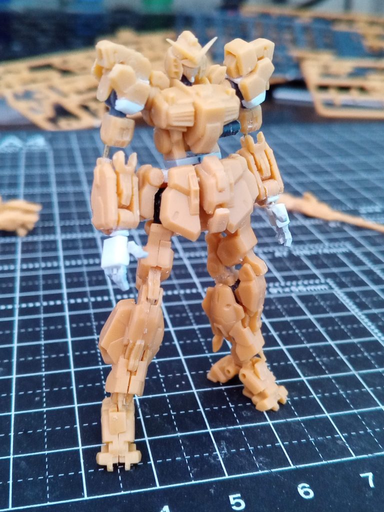 腰のフロントアーマーは、切り離して真鍮パイプでぶっさし可動。ボールジョイントにしたかったけど、スペースが確保できなく断念(泣)あと、脚部のボールジョインを差し込む場所が薄くて両足を接続するには薄いのでランナー板を両サイドに貼り付け、幅増し。サイドアーマーの位置も足の可動範囲の確保のため、切って、プラ板で位置調整(可動させても、足そんなに開かんしで省略)
