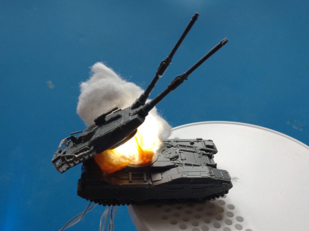 戦場感出そうとすると、爆破表現を加えたくなってしまいます。これも、安価でLEDを提供して頂ける100均さんがあるので、最近いろんな作品に埋め込みたい病です。