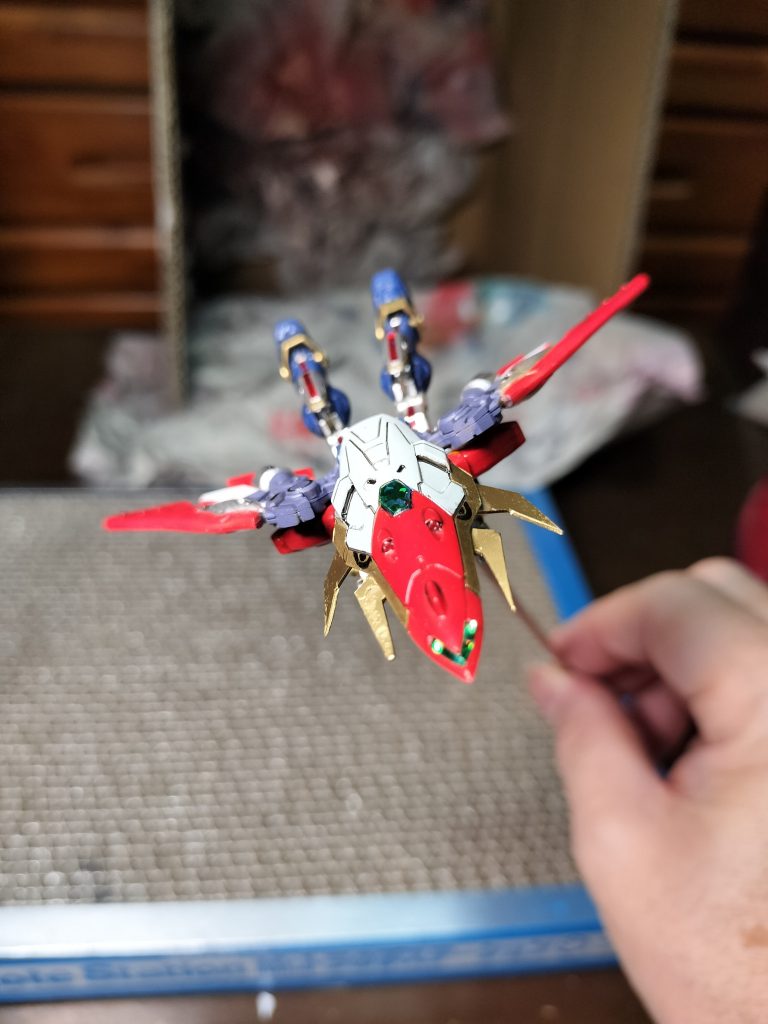 (2枚目写真)塗装して半分組み立ててから、はたとシールド(機首)の本体取り付け方法を考えていなかったことに気づく。