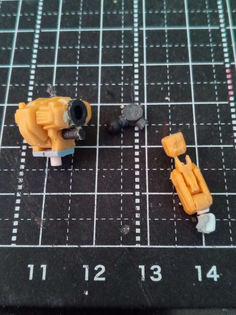 全体が出来てから、やはり肩の前後可動が欲しくなりボールジョイントを移植することにしました。胴体側にボールジョイントの受けの入るスペースを空け、エポパテで隙間埋めて固定。肩の方は、ボールジョイントの頭をTジョイントにくっ付ける(真鍮線を中に入れて強度上げてます)そして、元々の肩の接続部のディテールを切り取り、同じ位置にくっ付ける。
