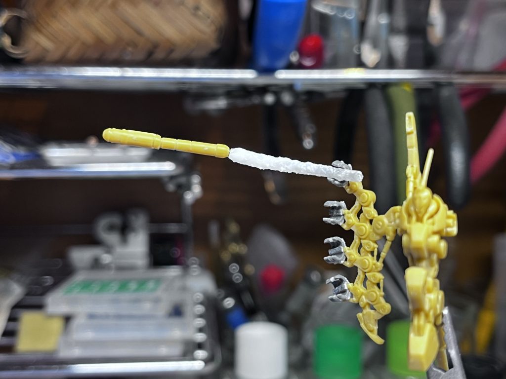 ミサイルの噴煙エフェクト。手芸用の綿を使うことも頭をよぎりましたがグフフラの時の反省(アーティファクトに綿はデカ過ぎる)があったので却下。タミヤの透明ソフトプラ棒の周囲に瞬着パテを盛って形を作り、さらにその上に瞬着を塗って固まる前にベビーパウダーをポンポンと叩き付けてテクスチャっぽく加工。パウダーのダマのランダムさとプラ棒のミサイル側とラック側の透明度の違いがチャームポイントですね。プラ棒の切断面の処理は要検討。