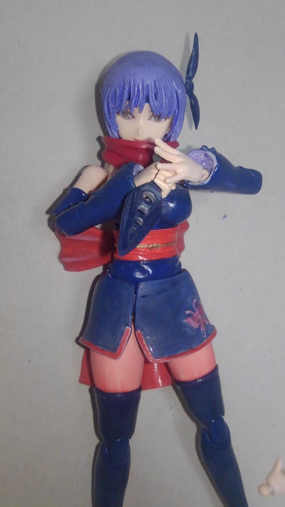 とりあえずエロさを隠すためデフォルト装備のマフラーを装着。これイイですね。太腿はストッキング?というかニンジャが良く付けてそうな網っぽい何かを付けてる感じにしようかと思います。改造しているうちに可動範囲もおかしくなりました。その辺も見直したので立ち姿が良くなりました。こんな感じで改修していきます。