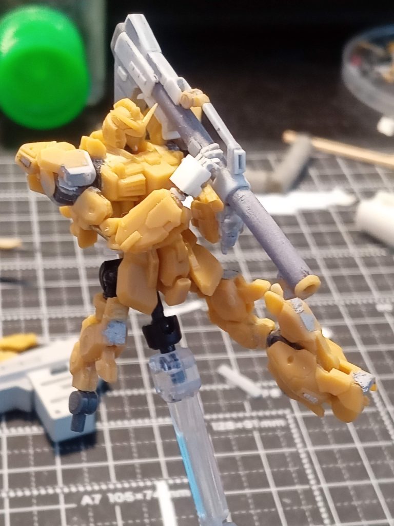 バズーカは、HGのMk2のものに似せて、ほとんどスクラッチ。銃身はプラランナー、あとはプラ板。アーティファクトのニュアンスをと銃口部分はドムトロの足についてたホバーセンサー?の円柱の間を輪切りにして、銃口下とセンサー付け根にサンボルジムのアームを切って移植。