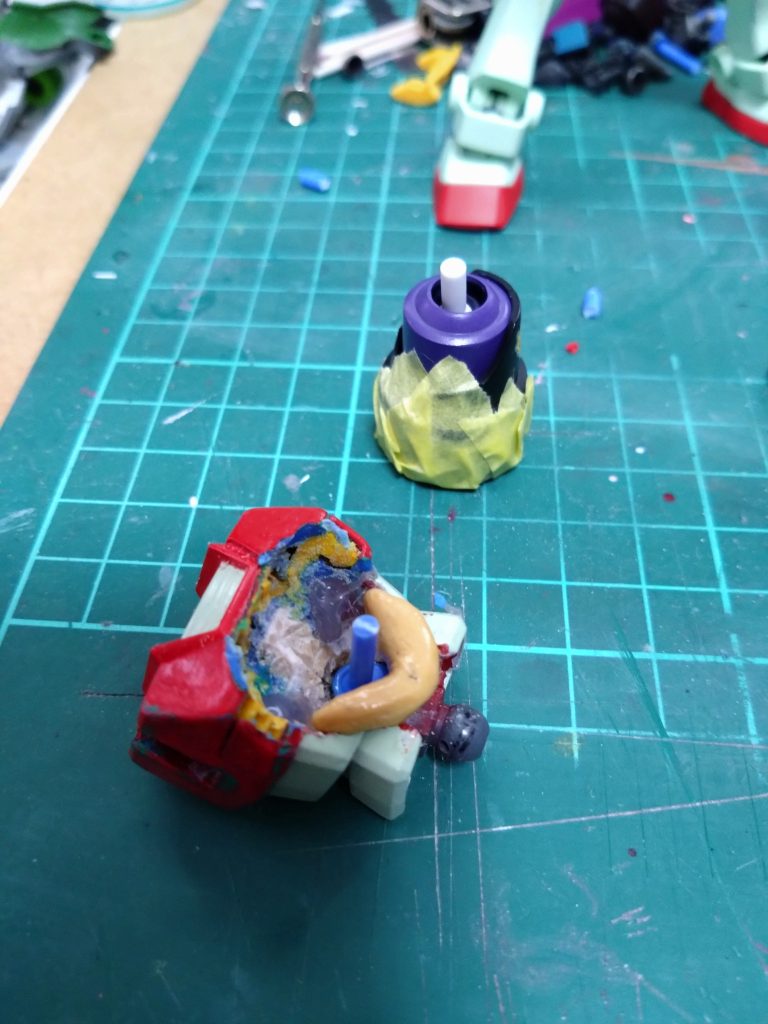 位置が決まってパーツ合わせてできる隙間にはパテを盛ってマスキングしたズゴックパーツを合わせて確認、パテの乾燥待ちです。