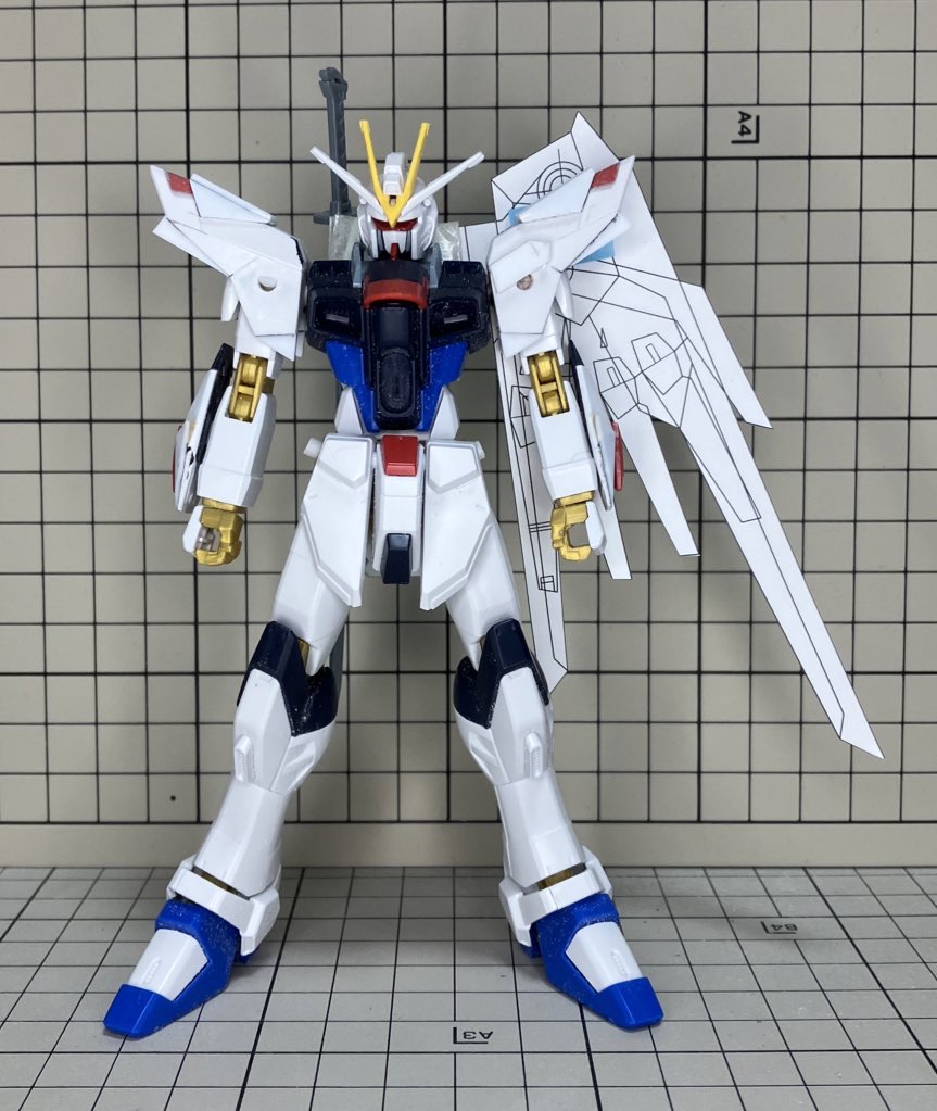 ガンプラ用SNSでガンプラ改造の無い製作記を書いていくスタイル。 と言う訳でこんばんは。 今回はマイフリの羽の製作にあたりCADによる設計を導入しました。 と言うのも複雑な面構成のデザイン、展開機構、大量のドラグーン?やそのマウント部などもはや人力では困難で、設計後のプラ板切り出しの作業量が膨大すぎるため、 それらの問題を解消し効率化を図ることを目的としています。 作業の流れとしては、 手書きで大体の大きさを決めて、 CADに落とし込み、 紙に印刷してプラモに合わせてバランスチェック。 良ければ各パーツごとにバラして配置、 それを印刷してプラ板に貼り付けて切り出すと言う寸法です。 このやり方では精度良く多くの部品を切り出すことができるはずです。 まぁ、明日からひたすらにプラ板を切り出す作業が待ってます…(´・ω・`) 頑張れわたし…!!