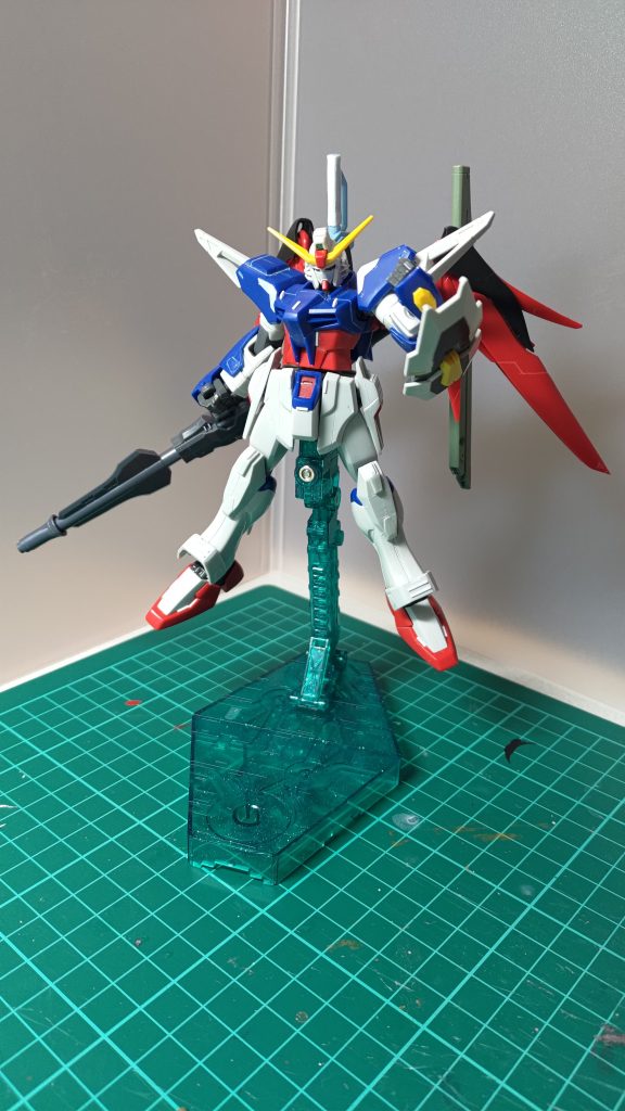 写真1:ただ、盾を装備する丸穴が見えちゃうのがアレですけどね。右手に持っているのはバルバトスに装備させた轟槍鬼十字に付属する銃、轟鬼雷砲です。装甲を取られたので廉価版になりますが、デスティニーには長物が似合う!