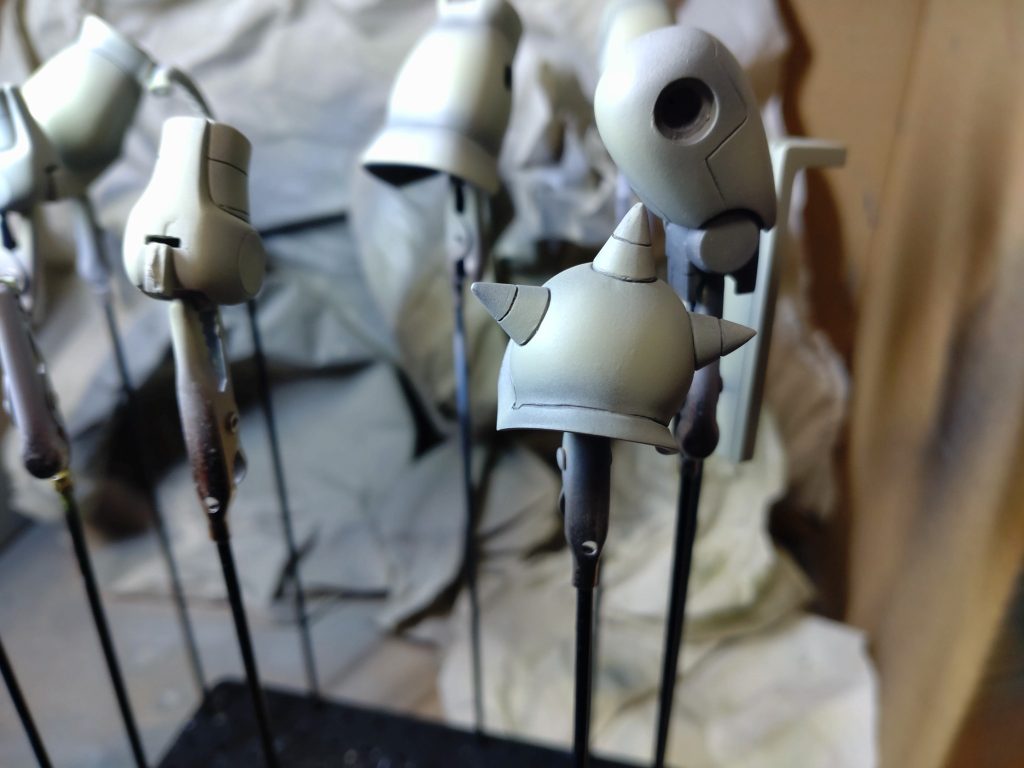 というわけで、今回はグレーサフ後にシャドー部分をジャーマングレー吹いて、グリーン部分を細吹きして仕上げております。