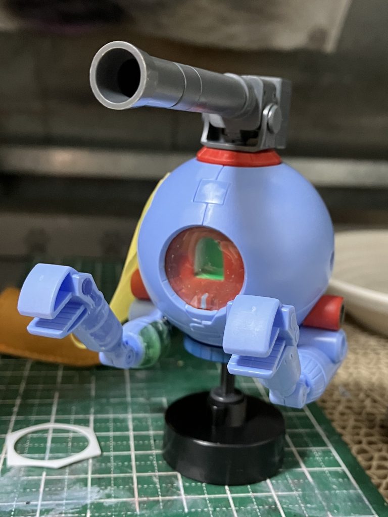 当初は普通に穴を開けようかと考えていましたが、耳部分がちょうどコクピットに見えたのでこうなりました。